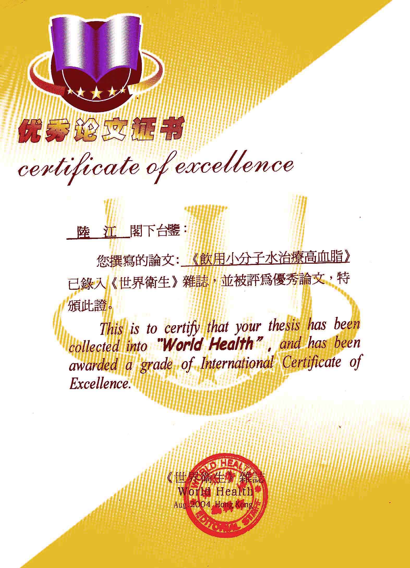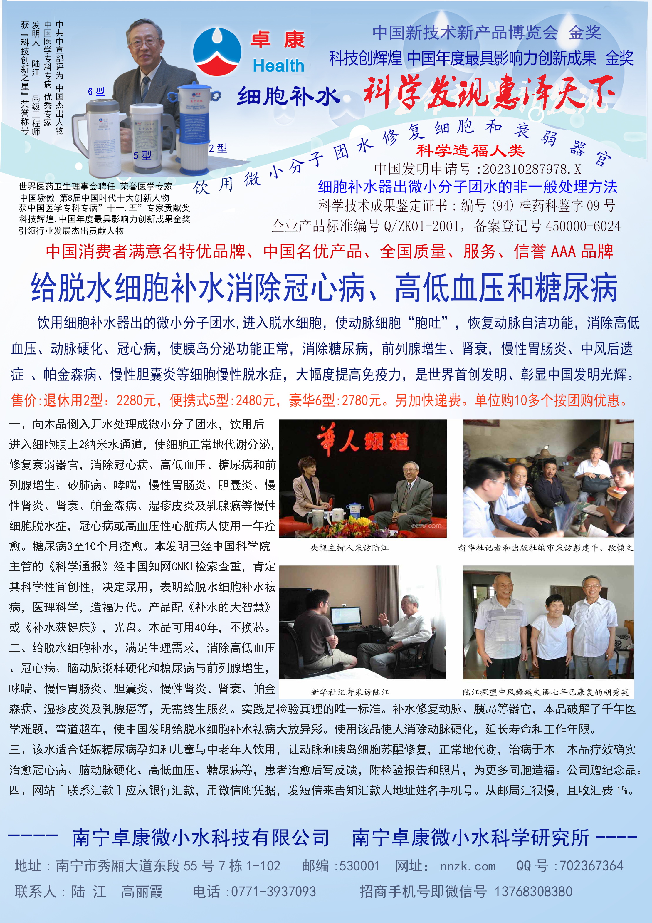 人類幾千年來(lái)患以上病癥需終生服藥,幾十年也不能治愈??墒俏覈?guó)南寧的高級(jí)工程師陸 江,于1990年想根治高血壓,研究發(fā)明了離子水瓶,處理出微小分子團(tuán)水供飲用,經(jīng)過(guò)醫(yī)院臨床試用和專家鑒定,1999年獲中國(guó)發(fā)明專利權(quán),產(chǎn)品于2000年投放市場(chǎng)后一直跟蹤調(diào)查,據(jù)全國(guó)各地用戶反饋:祛除了高低血壓、糖尿病和冠心病,并使前列腺增生、咽喉炎、鼻竇炎、慢性氣管炎、支氣管炎、矽肺病、哮喘、慢性胃炎、腸炎、慢性膽囊炎、慢性腎炎、腎衰、膀胱炎、便秘、痔瘡、風(fēng)濕性關(guān)節(jié)炎和濕疹皮炎及中風(fēng)后遺癥等病癥不藥而愈。為什么喝微小水能治20多種病?陸 江從1991年德國(guó)科學(xué)家發(fā)現(xiàn)細(xì)胞膜水通道僅為2納米獲得啟發(fā),認(rèn)為多種器官患病是因細(xì)胞脫水,不能正常代謝和分裂增殖,才使器官細(xì)胞減少致衰弱萎縮而形成細(xì)胞缺水性病癥。22年來(lái)的實(shí)踐有力地支持了“細(xì)胞脫水致病”這一重要論點(diǎn),表明喝微小水可滿足細(xì)胞的生理需求,補(bǔ)水就能祛病,是生命科學(xué)新亮點(diǎn)。